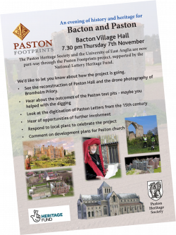 An invitation to Bacton village hallSeveral visits for inspiration and planning were made to Bromholm Priory itself, and local knowledge was enlisted. Documentation about the priory over the years was collected. A meeting at the village hall gathered further details and ideas for the coming months, though follow-up was disrupted through the Covid restrictions. The modelling of the priory continued as part of Paston Footprints and has led to the 3D presentation and further artwork. Great co-operation was received from the landowner for both visits, and for the extensive drone photography undertaken.