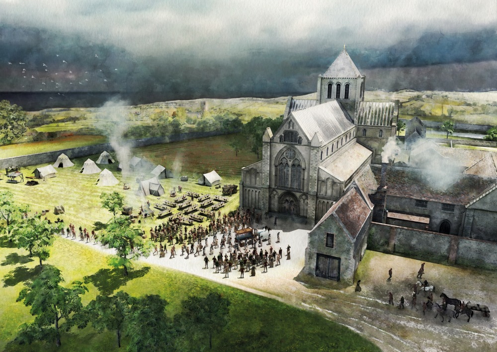 One of the most amazing events at Bromholm Priory was the funeral in the early summer of John Paston (1421-1466). He had died in London in late May 1466 and the Paston Letters record the extraordinarily lavish arrangements that were made to bring his body back to Norfolk for burial at Bromholm Priory. Our historical artwork here uses the 3D recreation of the priory as the basis of a depiction of the funeral. He would not stay for ever in peace there; at the time of the dissolution of the monastery, his body was taken to the churchyard at Paston church, where it rests - unmarked - today.