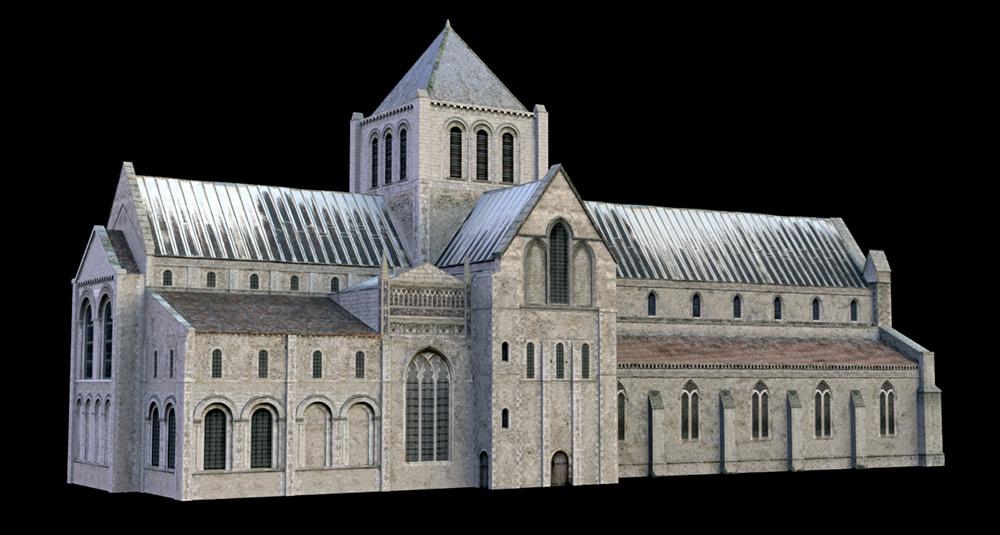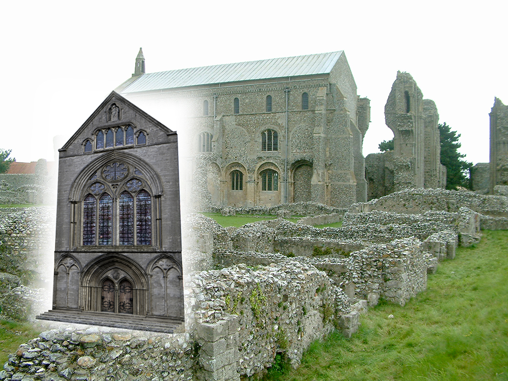 Creating features and textures for long-gone walls has to be based on evidence, finds of stones or comparable buildings. For the west facade our 3D artist has looked at the mother Cluniac priory of Castle Acre and at the Benedictine priory of Binham Abbey. The latter has been used to suggest a design for the west facade of the Bromholm model. Binham itself comes into the Paston story later on; after the dissolution it becomes the property of Thomas Paston, and he and his grandson begin to demolish it to reuse its stone.