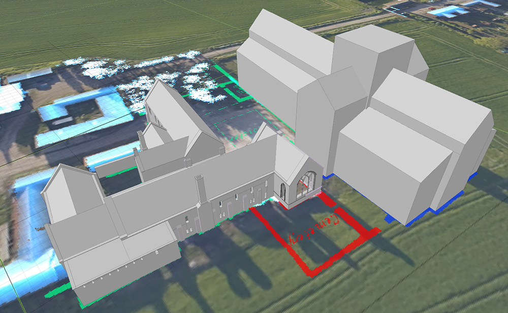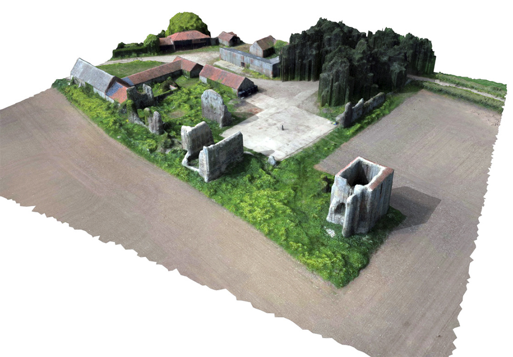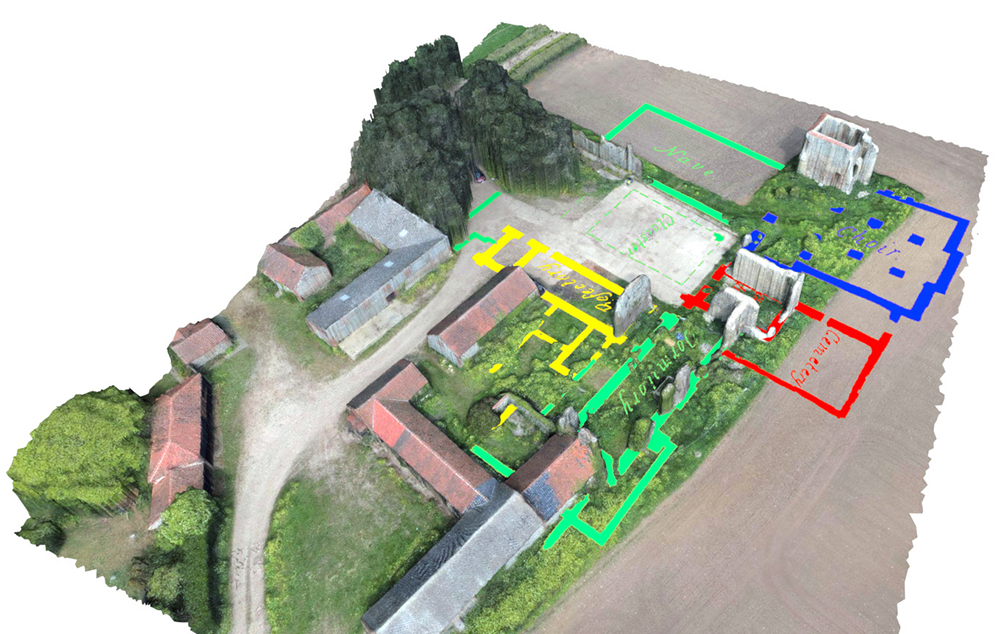 A full photogrammetric survey was undertaken of the site. About 400 photos were taken by a drone circling the area, with a further set of pictures taken vertically. Specialist processing software turns these images into 3D models; the perspective view shown gives an explanatory view of the site, and the vertical view supplies a base for the historic modelling. The camera on the drone records the location and height from which each image is taken, and this enables the model to be placed with great precision.
