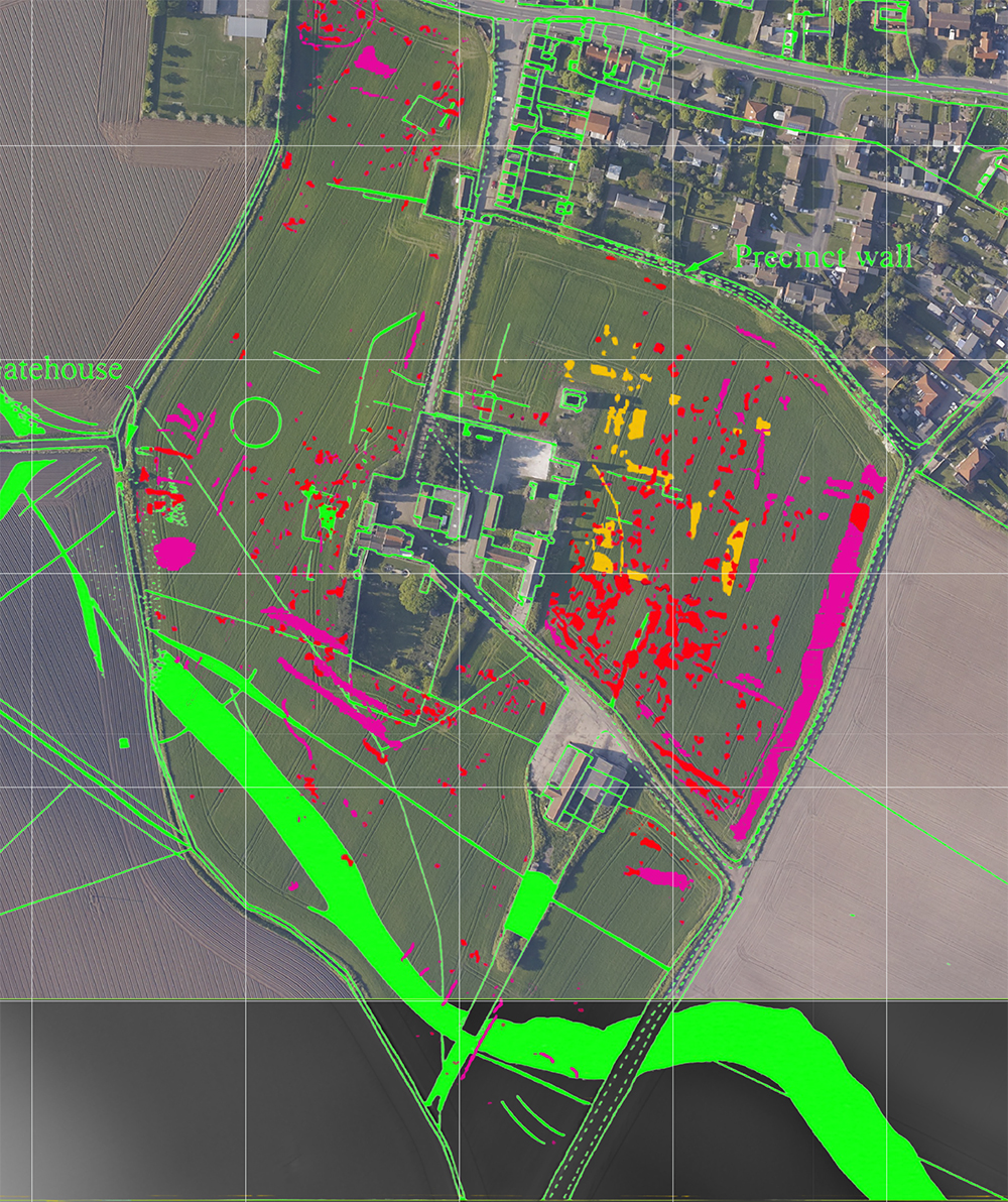 English Heritage undertook geophysical surveys of the site in November 2005 and March 2006. Overlaying their areas of magnetic anomaly provides further evidence of possible areas of interest. Their full report can be accessed and downloaded as a PDF from the English Heritage site.
