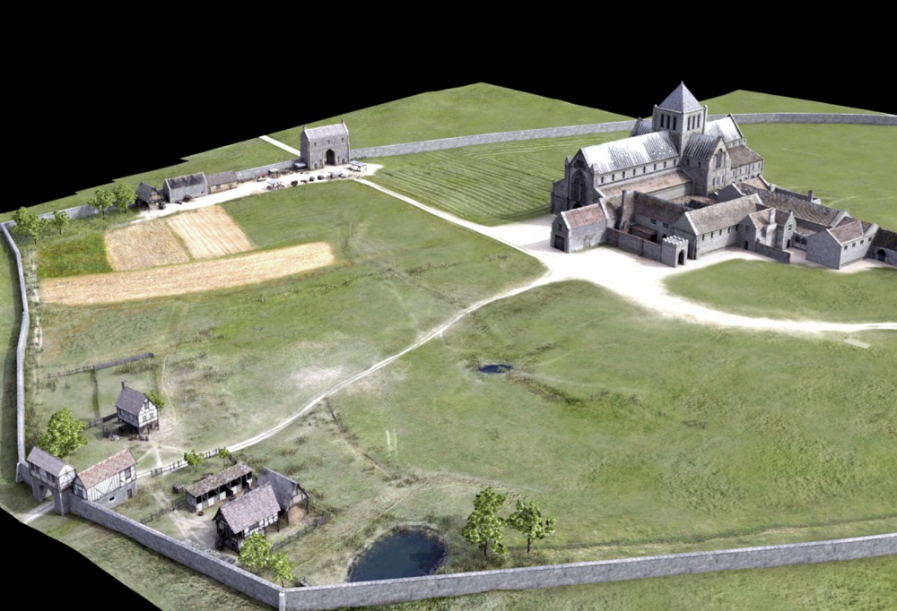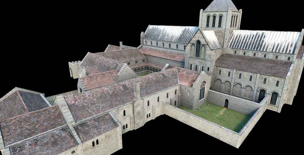 Detailed modelling of the priory has continued over the months. The cemetery in the foreground and the cloisters in the middle of the complex can be seen. The dormitory block in the centre foreground is now complete. There's a little more attached to this main area to do, working from geophysics evidence of an industrial area, and then we'll put a 3D model on the screen.