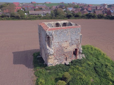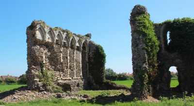 The chapter house in the 21st century. The site is on private land.The distinctive remains of the priory of Bromholm stand on private land on the edge of the village of Bacton. The north gate is at the end of Abbey Street; in its time the site has been referred to as an abbey rather than a priory, but given the lack of clear distinction between the two terms, that is not surprising. Headed by a prior, Bromholm Priory is generally accepted as the correct title. All the subsidiary houses of the abbey of Cluny in Burgundy were referred to as priories. Bromholm itself was founded as a subsidiary of Castle Acre in Norfolk, but eventually became independent in 1298.