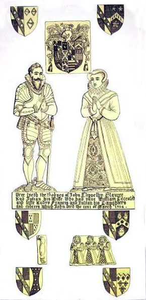 John Sell Cotman's 1813 drawing of the Clippesby brass. The brass shows John Clippesby (d.1594) and Julia(n) his wife, t)he infant William, decesed, in a shroud and their daughters Audrey, Frances and Julia(n). The Paston arms are impaled on the lower right shield.