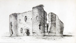 Drayton Lodge, 19th-century engraving, drawn and etched by Henry Ninham (1796-1872).The building, until 2023 somewhat decayed but now conserved, is in the form of a small, rectangular tower house, internally measuring 6.9 m., east to west, and by 5.0 m., north to south, with a drum tower at each corner. The walls have a maximum height of approximately 6.0 m. Those on the north, east and south are, on average, 0.8 m thick, while that on the west side is broader, at 1.1 m.