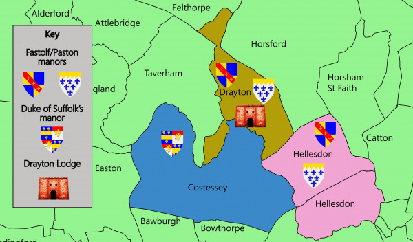 Fastolf, who had served with great distinction in the Hundred Years' War, subsequently invested much of his enormous wealth, gained from profits of war, in estates in England. However, some of his acquisitions lacked good title and, in later life, this involved him in numerous disputes, not least with the Duke of Suffolk, who was lord of the adjoining manor of Costessey and who, himself, entertained some claims to the manor of Drayton.