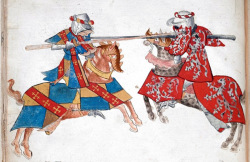 Sir John Fastolf (on left) jousting with Sir William Oldhall of Narford, from Sir Thomas Holmes's Book of Arms, c. 1445-c. 1450 British Library, MS Harley 4205, fo. 36vFastolf retired from military service in about 1440 and returned to England. Since 1426, he had regularly been sending home massive sums of money – his war profits – which were largely invested in the purchase of lands, in Norfolk and elsewhere, enabling him to enjoy a lifestyle of great wealth and luxury. He took up residence variously in Southwark and East Anglia, and built Caister Castle, as well as Drayton Lodge. However, during the last twenty years of his life, he was embroiled in almost endless lawsuits, and the Paston Letters depict him in his later years as an irascible, litigious old man. On his death, his estates were inherited by the Pastons.