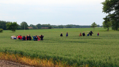 Pupils from Gresham Primary School follow the path across to the castle.In the first phase of the project, the meeting was with pupils of Gresham Primary School - appropriately enough at the castle! The school had made special arrangements with the landowners for access to the site, after essential safety checks, a whole class made their way across the field to meet Margaret Paston and one of her retainers.