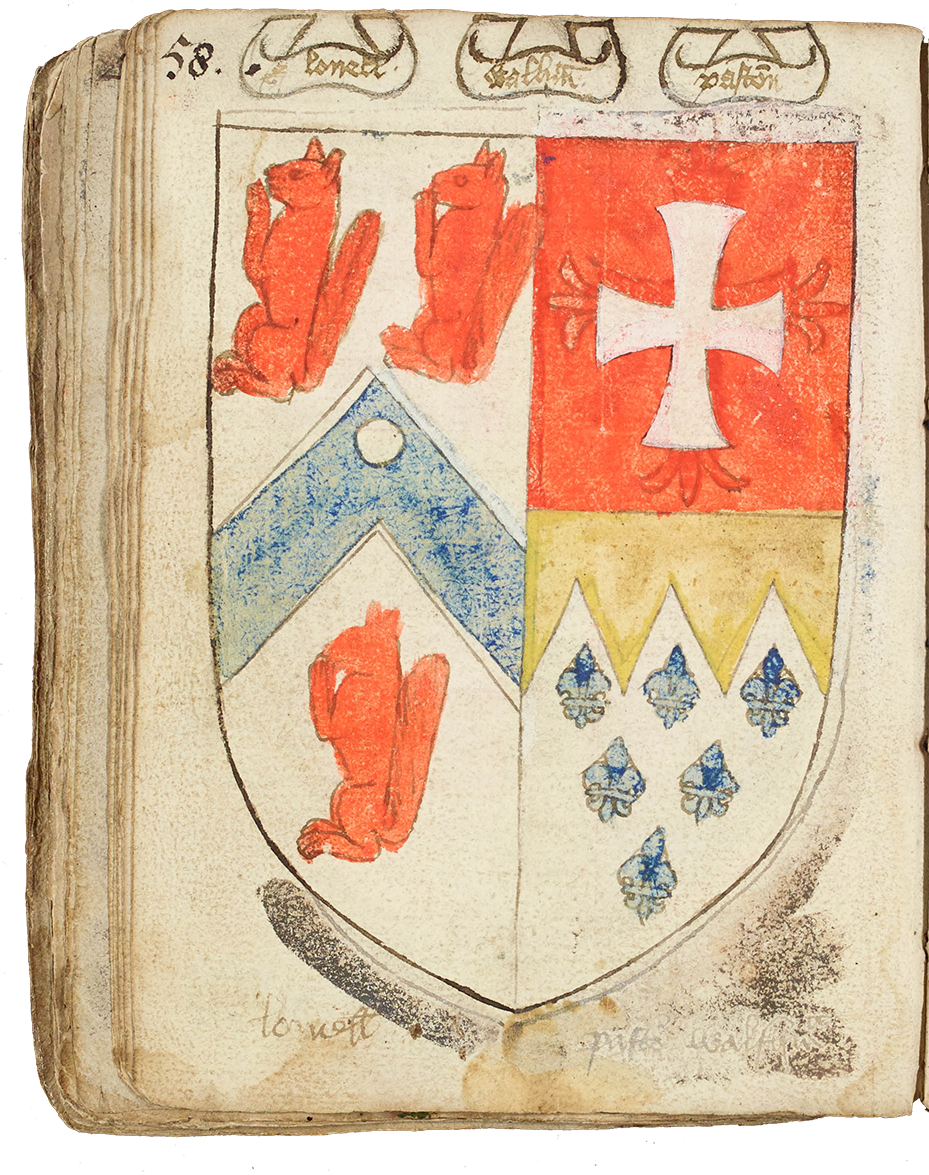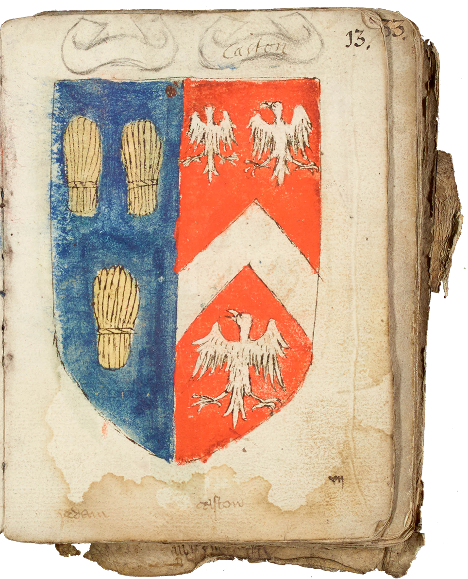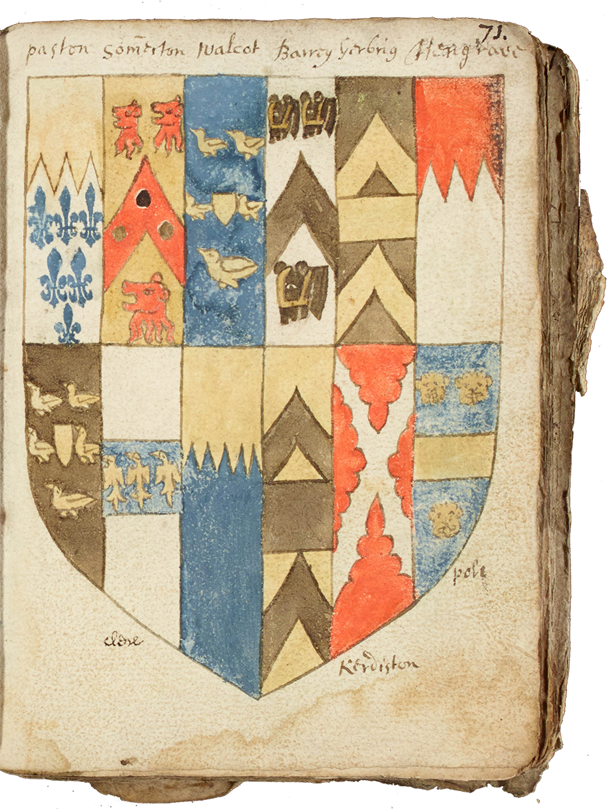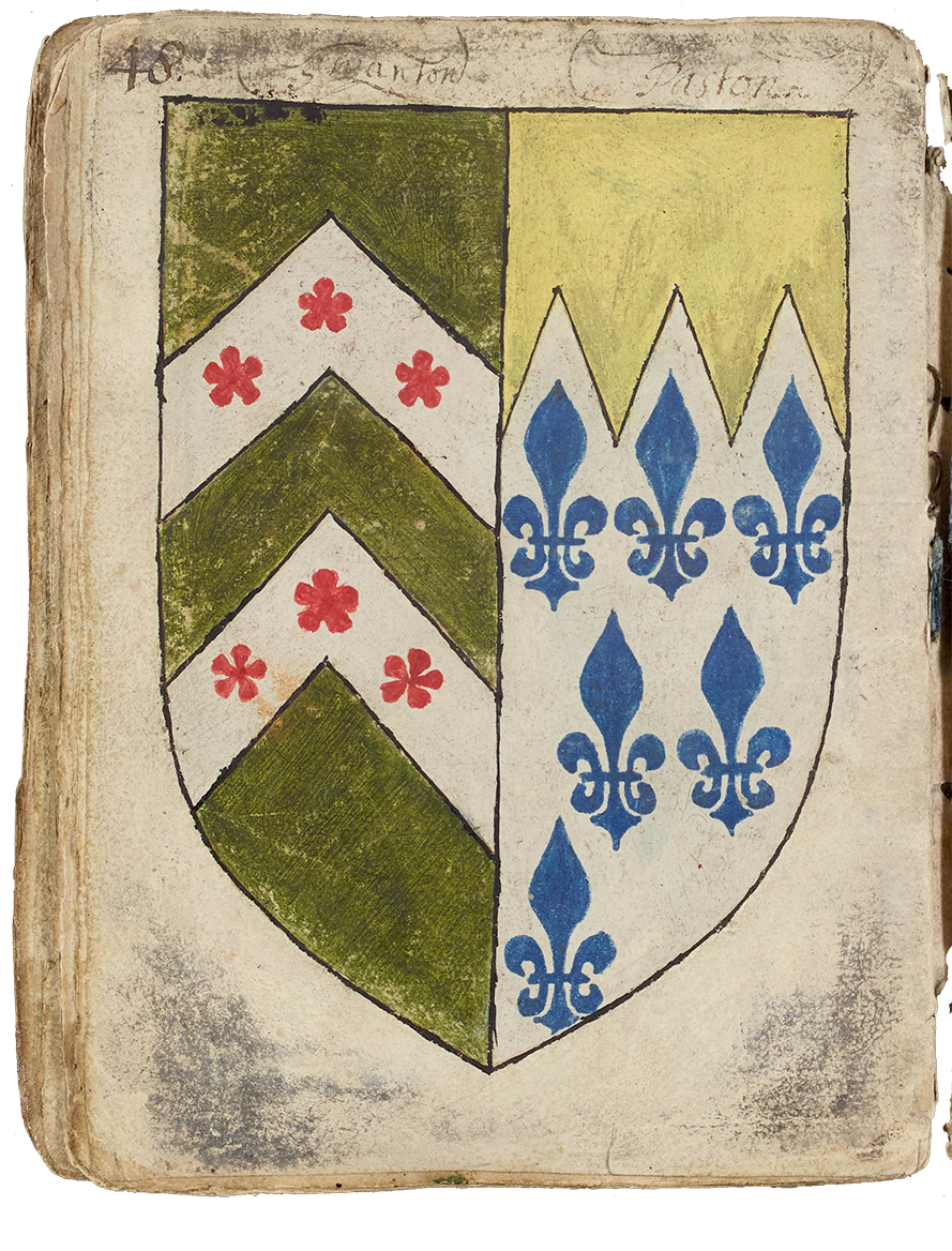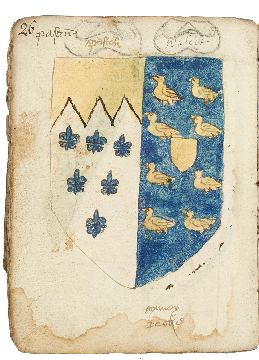 One of the fascinating documents among the Paston Letters is a book which has traditionally, though not necessarily correctly, been attributed to Friar Brackley. The first part consists of a series of coats of arms of friends, relatives and associates of the Paston family. On the latter pages are notes on French grammar, probably made by a young William Paston (1436-1496) while at the University of Cambridge. He may in fact have been the artist of the shields, and with the rarity and expense of paper, decided to use some pages for his notes.