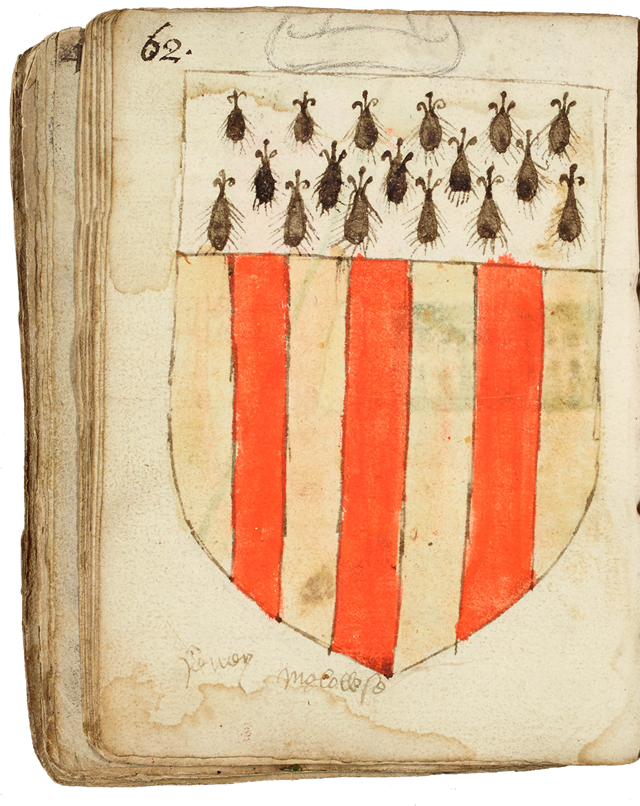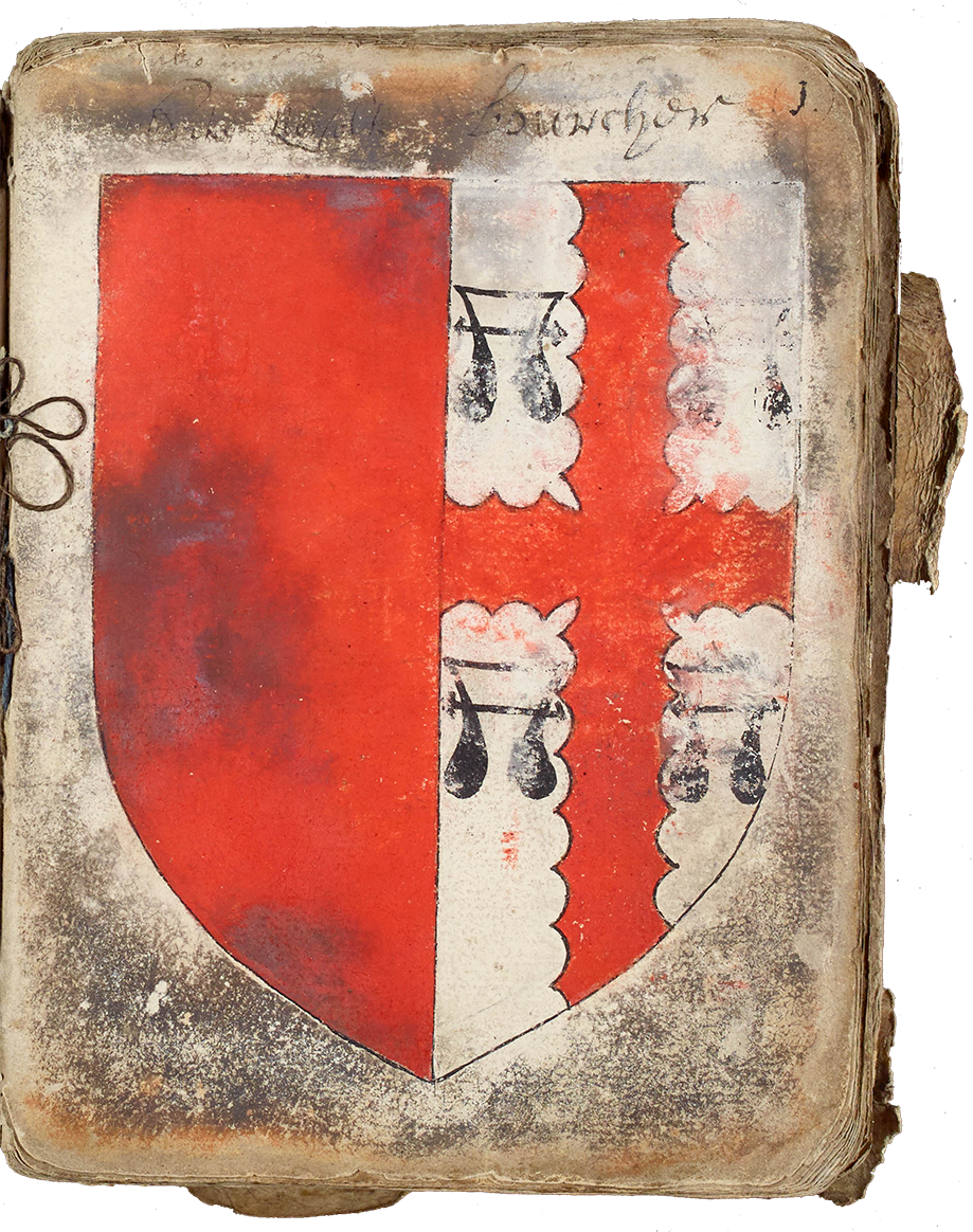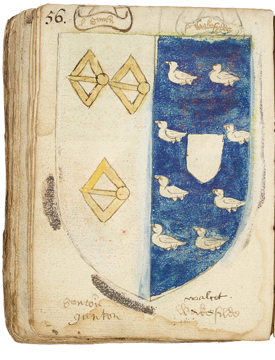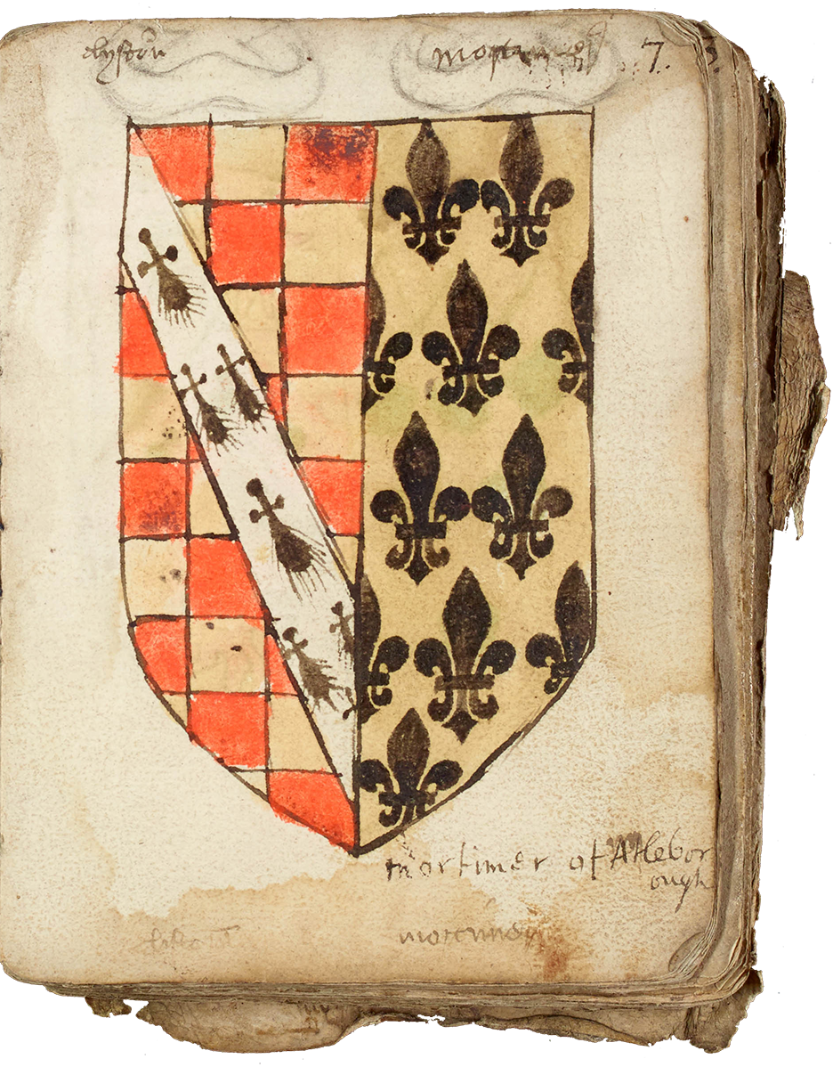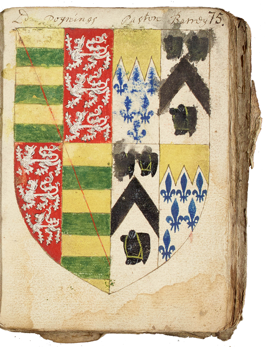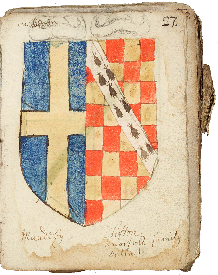 One of the fascinating documents among the Paston Letters is a book which has traditionally, though not necessarily correctly, been attributed to Friar Brackley. The first part consists of a series of coats of arms of friends, relatives and associates of the Paston family. On the latter pages are notes on French grammar, probably made by a young William Paston (1436-1496) while at the University of Cambridge. He may in fact have been the artist of the shields, and with the rarity and expense of paper, decided to use some pages for his notes.