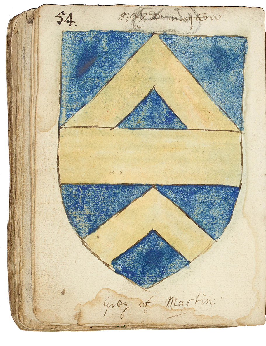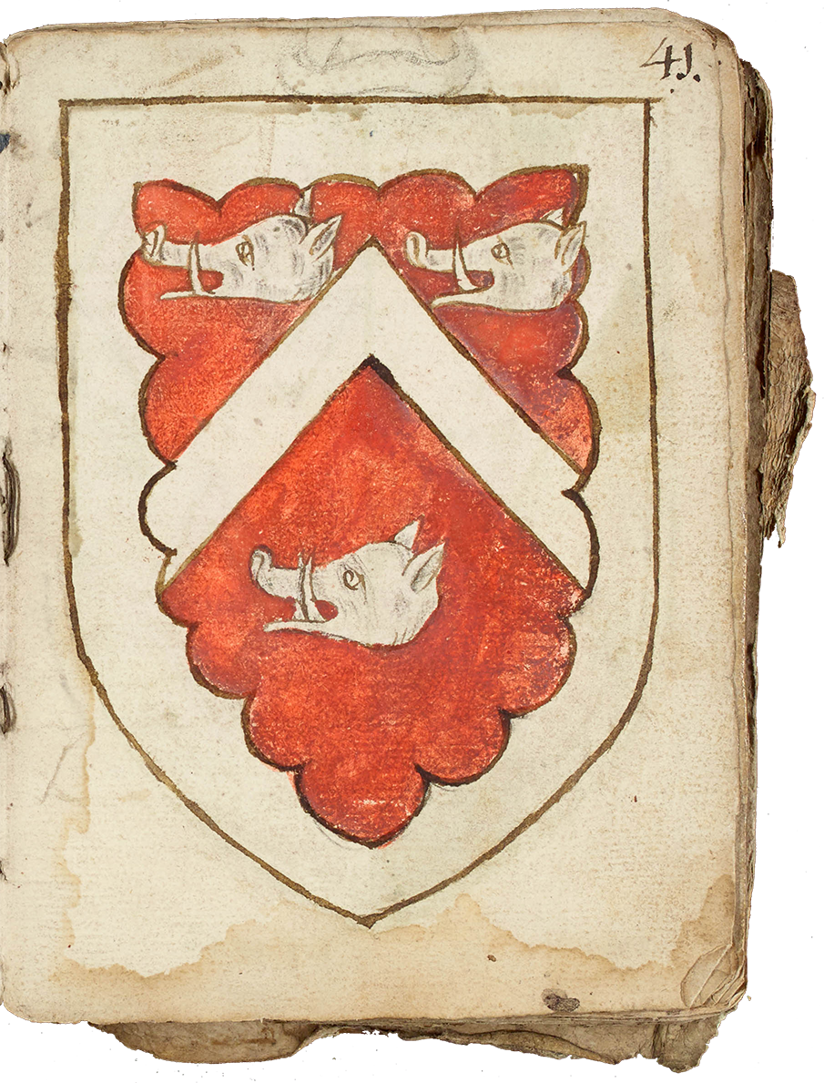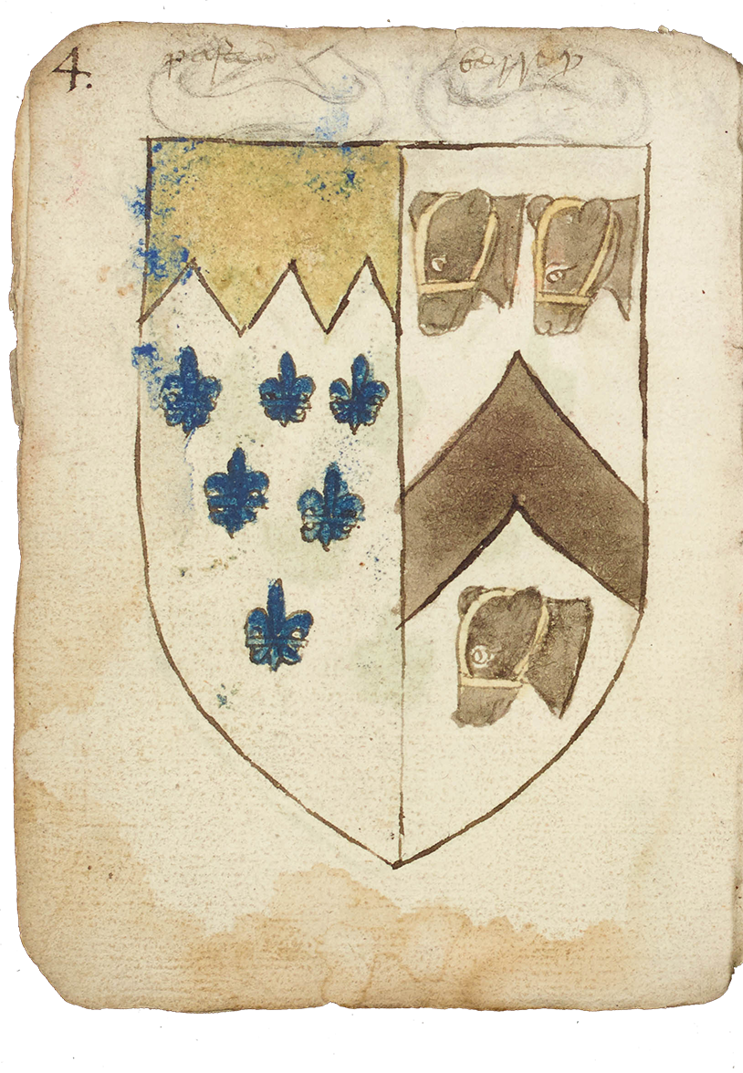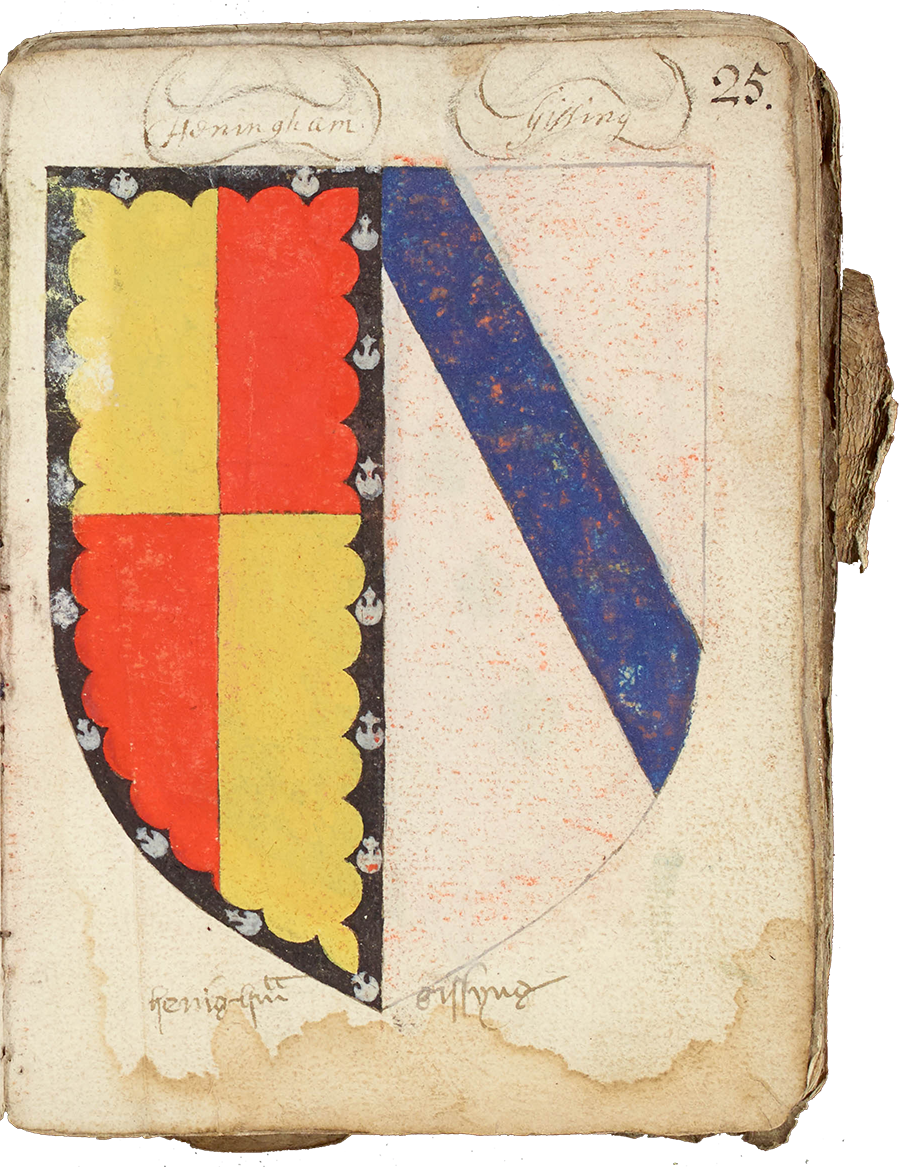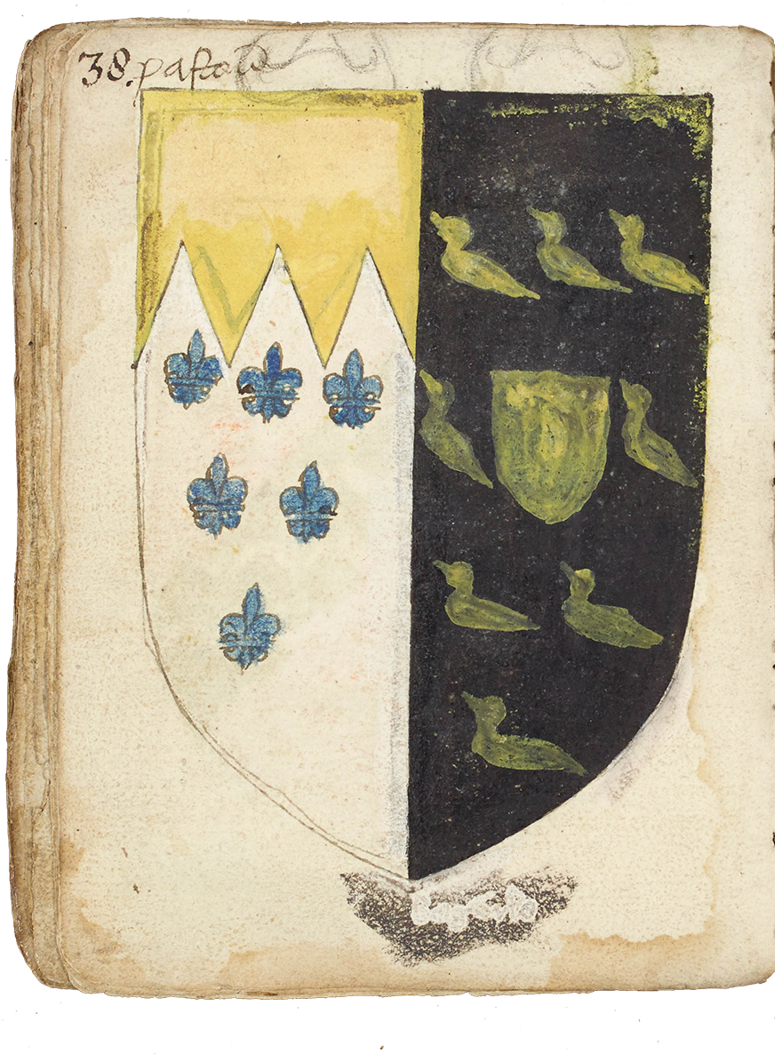 One of the fascinating documents among the Paston Letters is a book which has traditionally, though not necessarily correctly, been attributed to Friar Brackley. The first part consists of a series of coats of arms of friends, relatives and associates of the Paston family. On the latter pages are notes on French grammar, probably made by a young William Paston (1436-1496) while at the University of Cambridge. He may in fact have been the artist of the shields, and with the rarity and expense of paper, decided to use some pages for his notes.