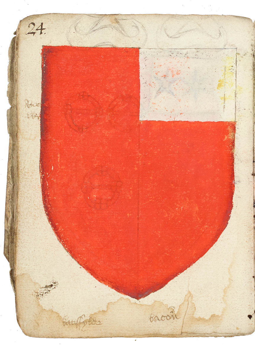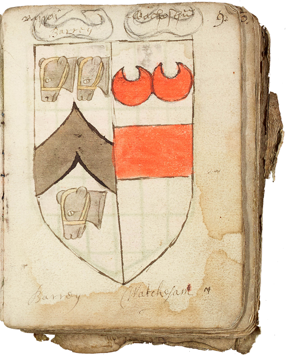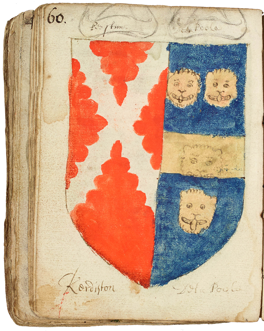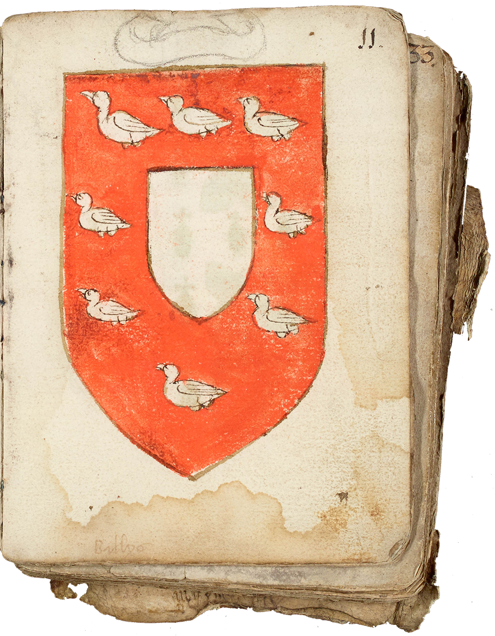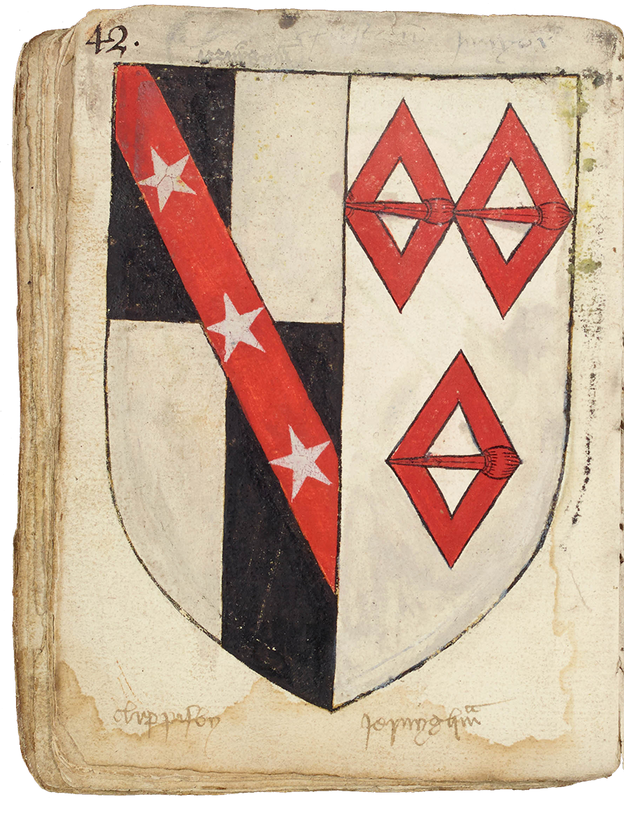 One of the fascinating documents among the Paston Letters is a book which has traditionally, though not necessarily correctly, been attributed to Friar Brackley. The first part consists of a series of coats of arms of friends, relatives and associates of the Paston family. On the latter pages are notes on French grammar, probably made by a young William Paston (1436-1496) while at the University of Cambridge. He may in fact have been the artist of the shields, and with the rarity and expense of paper, decided to use some pages for his notes.