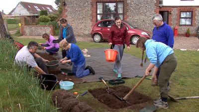 A number of groups enthusiastically dug up their front lawnsOne of the projects undertaken by the Paston Heritage Society and Corenza Lewis and her team from the University of Cambridge was the digging of archaeological test pits in the village.