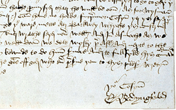 Sir Edmund Bedingfeld signs his letter of warning. British Library BL Add. 27446, f. 64In 1487 Sir John Paston III, in his capacity as Deputy Lord High Admiral, was required to pass ruling over the fate of a beached whale at Thornham in North West Norfolk. Paston's responsibilities would have covered the coast and ports from King's Lynn to Yarmouth.